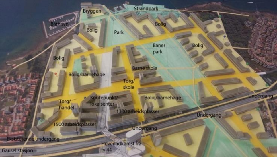 I saksdokumentenen er områdene nærmest oss foreslås til boliger, tett bebyggelse i 3 – 7 etasjer. Resten av FS nord settes av til blandet bebyggelse med bolig, næring og tjenester. Det settes av tomter til skole og ny barnehage. Mye grøntområder og torg/gangveier. 3 nye underganger under jernbanen. Ingen gjennomkjøring, veien stenges etter svingen nord for oss. Ved Gausel stasjon planlegges det handel og tjenester. Det foreslås å tillate høyhus på opp til 18 etasjer på begge sider av jernbanen. Asfaltverket og mye av industrien skal vekk. Det antydes at søppelanlegget kan bestå mens boligene utbygges. Velstyret planlegger å engasjere seg i saken.