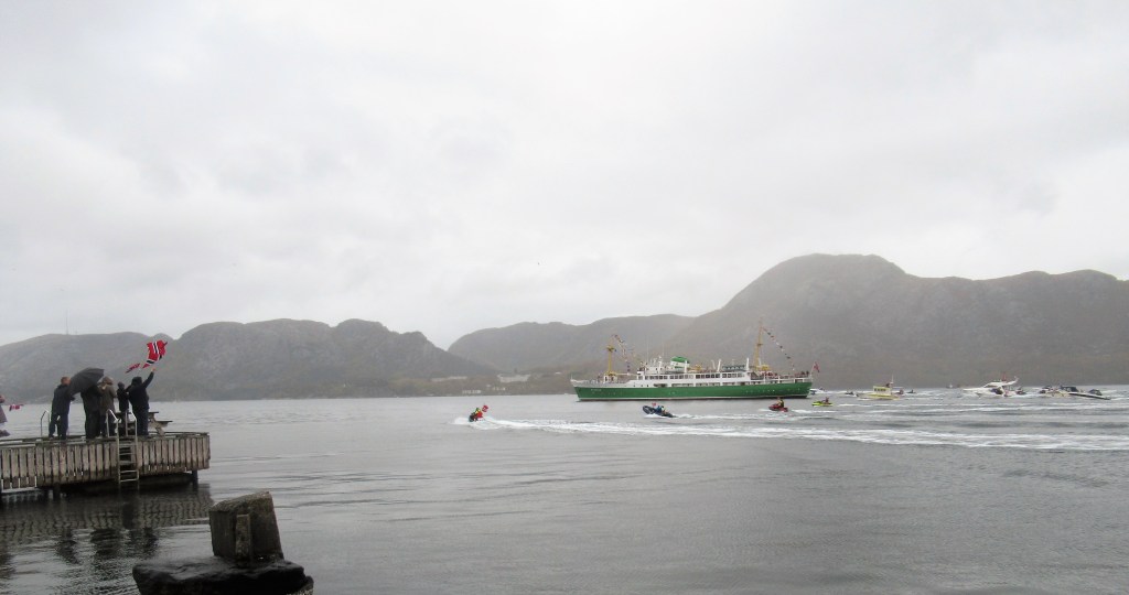 Og takk til kapteinen på MS Sandnes som etter vår oppfordring trosset ruteopplegget og satte kursen fra Strondavika til Forusstranda! Det var mange som møtte opp i regnværet og fikk meg seg den flotte konvoien!