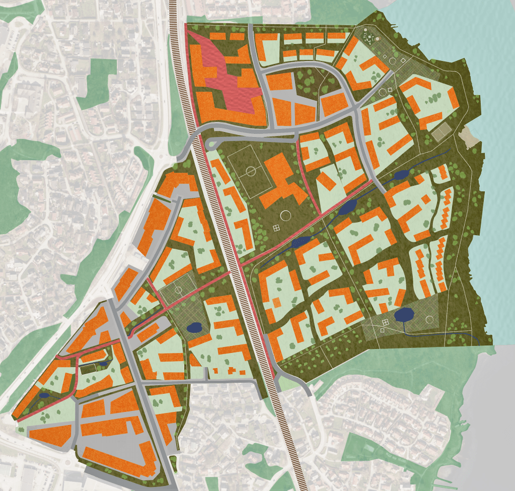 Et revidert planforslag ventes ut på høring om kort tid. Les mer her. En bred grønn sone nord for skogen, en 50 m bred grønn sone langs sjøen, maks. 5 etasjer og lavblokker og rekkehus ned mot sjøen. Høyblokka er borte, men det kan bli noen bygg opp til 8 etasjer nord på feltet. Mye av den eksisterende infrastrukturen er beholdt. Utnyttelsesgraden er redusert. Begrunnelsen er kvalitetskrav i kommuneplanen. Ett av feltene får innkjøring fra sør. Se saksdokumentene.