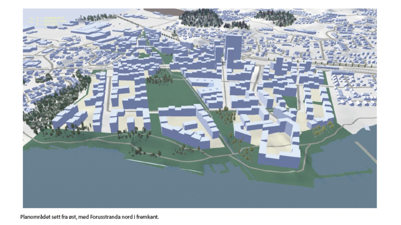 Et revidert planforslag ventes ut på høring om kort tid. Les mer her. En bred grønn sone nord for skogen, en 50 m bred grønn sone langs sjøen, maks. 5 etasjer og lavblokker og rekkehus ned mot sjøen. Høyblokka er borte, men det kan bli noen bygg opp til 8 etasjer nord på feltet. Mye av den eksisterende infrastrukturen er beholdt. Utnyttelsesgraden er redusert. Begrunnelsen er kvalitetskrav i kommuneplanen. Ett av feltene får innkjøring fra sør. Se saksdokumentene.